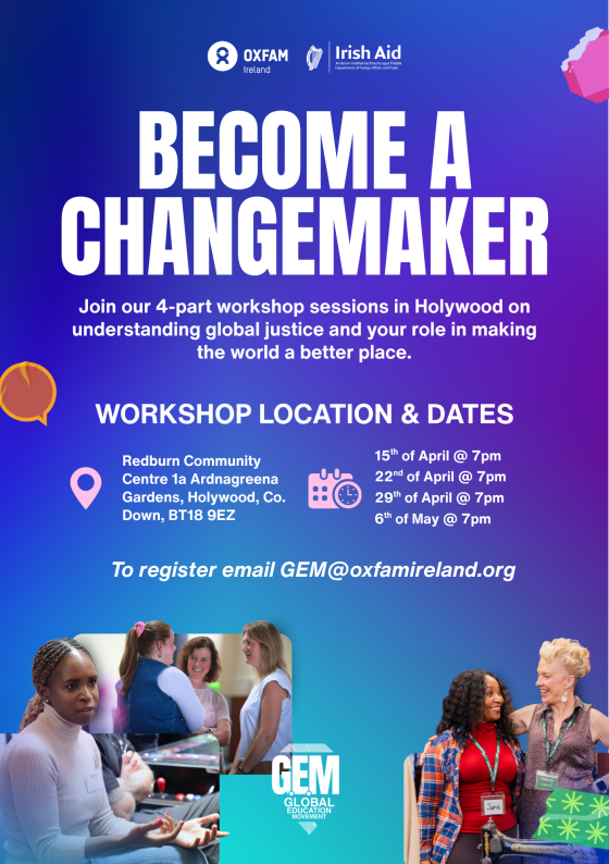 Oxfam Ireland Global Citizenship Education (GCE) programme, funded by Irish Aid. The programme brings people together to explore some of today’s most pressing global justice issues, including economic and gender inequality, climate injustice, and how our world is deeply interconnected and to reflect on how even small actions can contribute to change.
